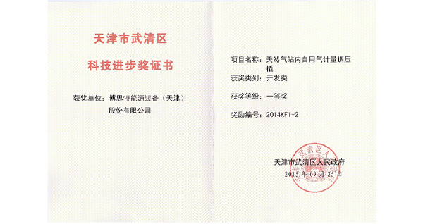 12月8日,武清区人民政府召开“2013-2014年度天津市武清区科技进步奖励工作会议”,博思特公司的“天然气站内自用气计量调压橇”项目,获得科技进步奖开发类一等奖。贝特尔公司的“发生故障完全开启的自力式轴流式调压阀自主研发自行转化推广”项目,获得科技进步奖开发类二等奖。