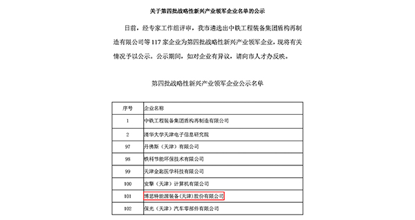 公司被评选为“天津市战略性新兴产业领军企业”。