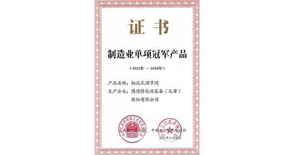 2022年7月,公司轴流式调节阀获得工信部颁发的“国家级制造业单项产品冠军”证书。