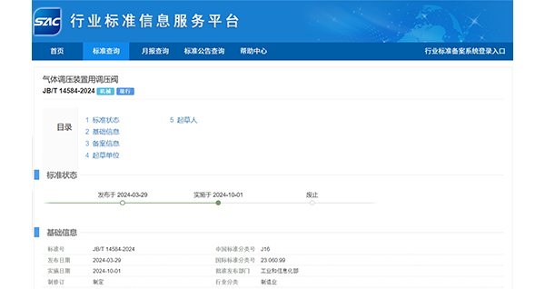 贝特尔公司主编的JB/T 145845-2024《气体调压装置用调压阀》机械行业标准于2024年10月1日起实施,填补了国内机械行业在该产品标准上的空白。