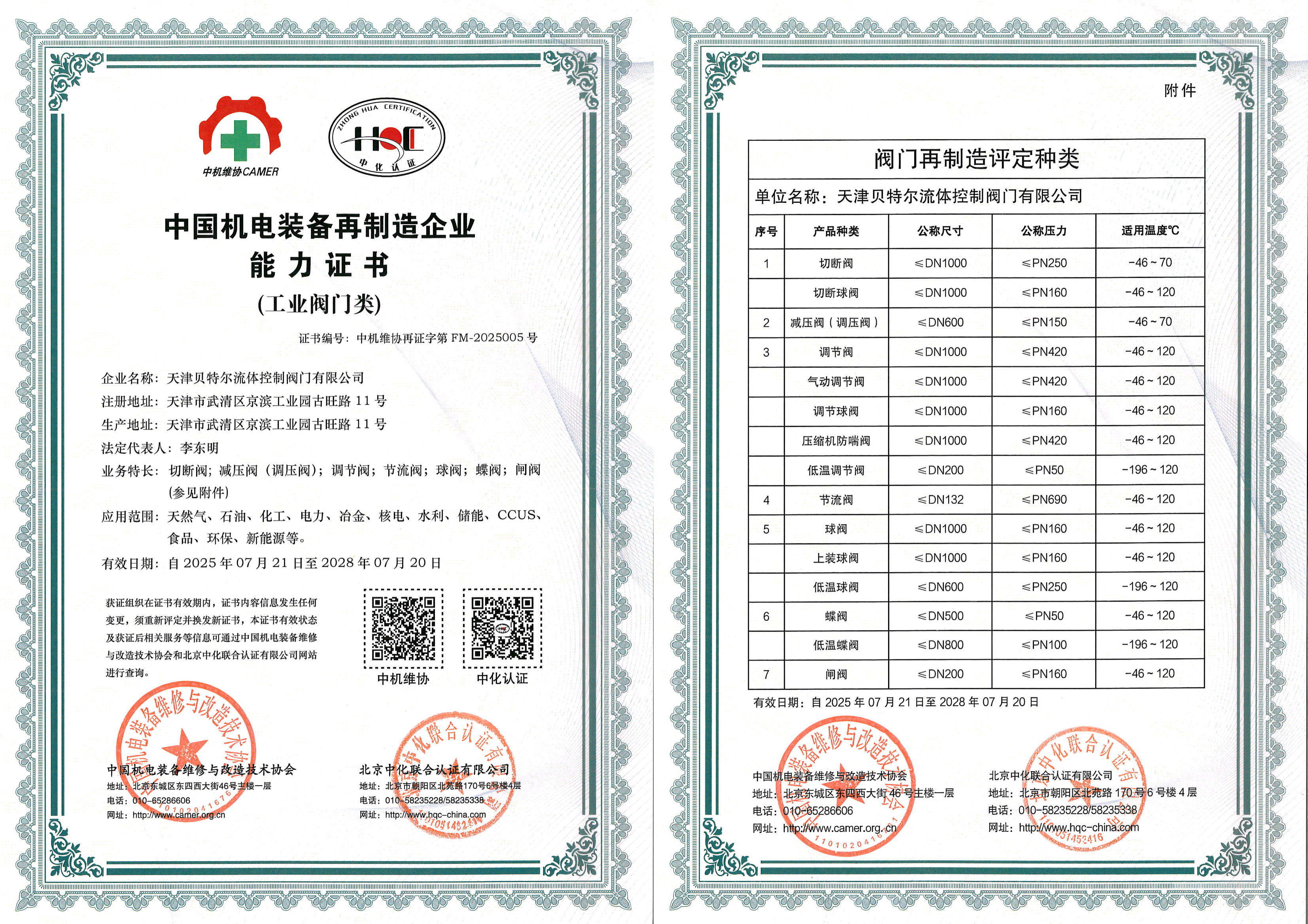 2025年7月21日,贝特尔阀门公司成功取得中国机电装备(工业阀门类)再制造企业能力证书,为公司拓展阀门再制造业务奠定了坚实基础,为公司的发展带来新的机遇。