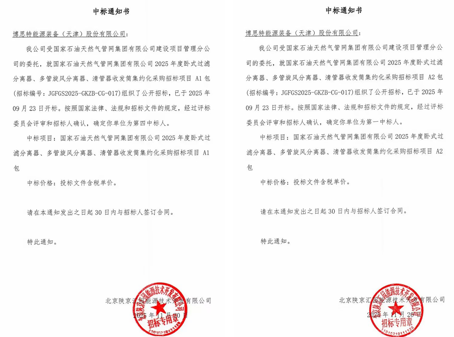 2025年11月20日,公司中标“国家石油天然气管网集团有限公司2025年度卧式过滤分离器、多管旋风分离器、清管器收发筒集约化采购招标项目”A1、A2包卧式过滤分离器(A1包获得第四名,A2包获得第一名),标志着我公司压力容器业务实现进入国家管网集团的重大市场突破。