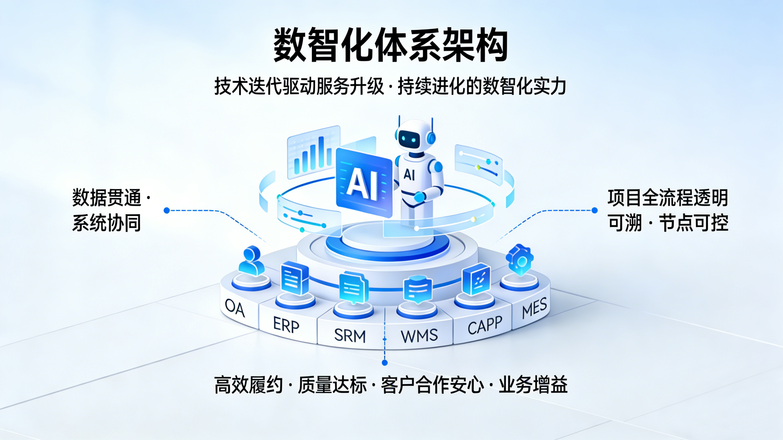 公司深耕数字化建设多年,构建以 ERP、SRM、MES 为底座、融合 AI 智能体的一体化数智化体系,通过数据贯通与系统协同,实现项目全流程透明可溯、节点可控,保障高效履约与质量达标,为合作提供数智化技术支撑与全流程管理保障。