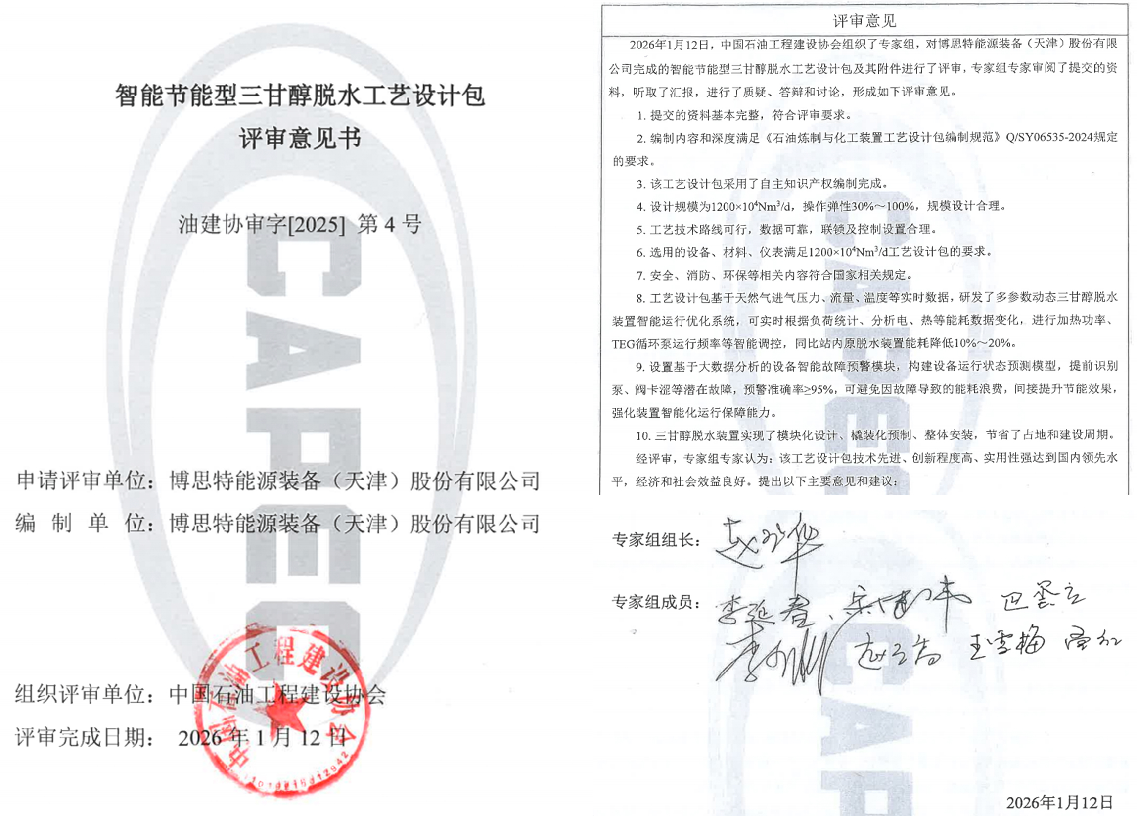 针对工艺包的进一步优化,专家组提出专项建议,博思特项目团队快速响应,严格按照专家建议完成优化完善,全面提升技术成熟度与工程适配性。2026年1月30日,公司正式收到中国石油工程协会盖章返回的评审意见书,标志着该工艺设计包顺利通过评审。