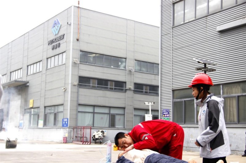 在人员疏散演练中,办公区、车间内还模拟了人员窒息昏厥,救护人员佩戴好防烟面罩,并为昏厥员工佩戴好氧气呼吸器,借助担架安全抬至楼下紧急集合点处。整个演练过程,救援人员反应迅速,处置得当,及时、高效地完成了本次救援演练任务。