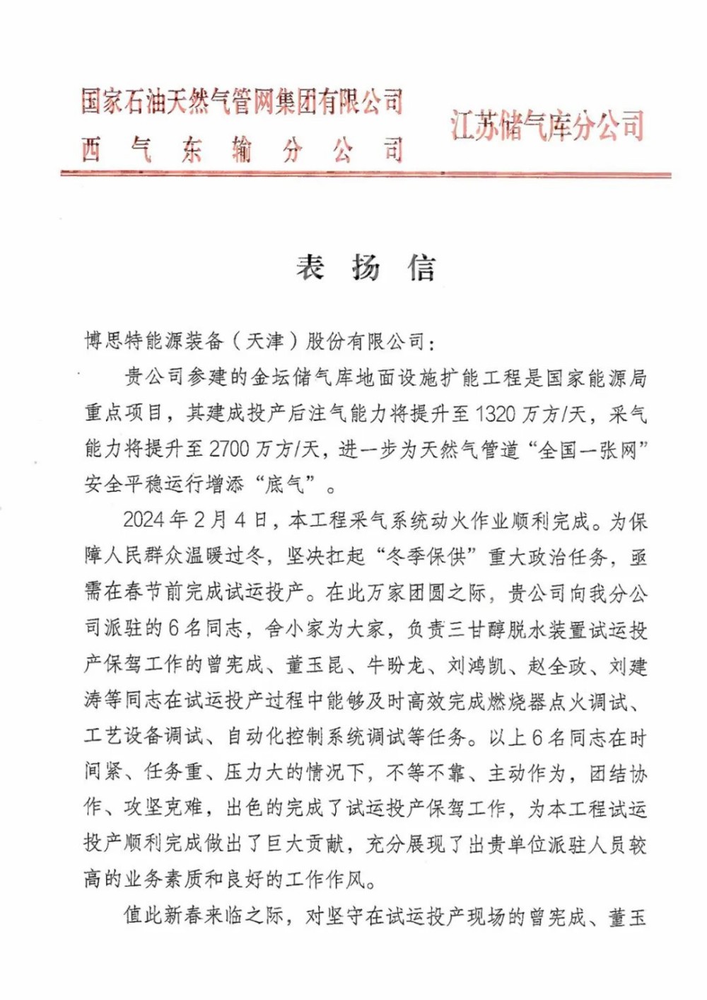 春节将至,公司收到了来自国家管网集团江苏储气库分公司发来的表扬信,对我公司正在进行的单列日处理量600万方脱水装置试运投产保驾工作给予了高度评价,对公司派驻的曾宪成、董玉昆、牛盼龙、刘鸿凯、赵全政、刘建涛六名技术人员在临近春节试运投产过程中做出的贡献给予了表扬!