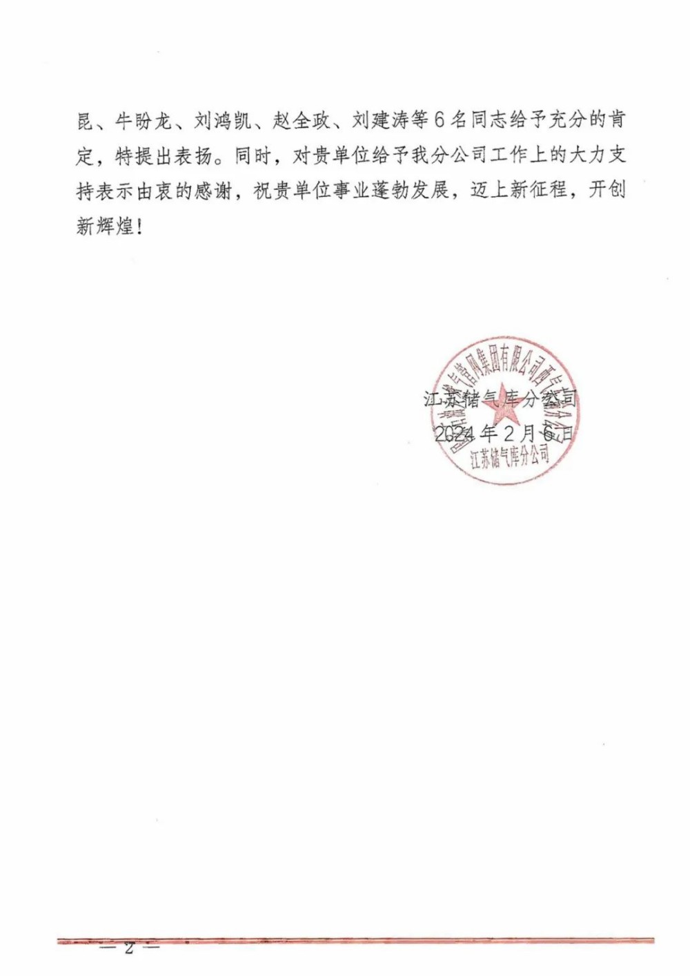春节贺礼——国家管网江苏储气库分公司发来表扬信!
