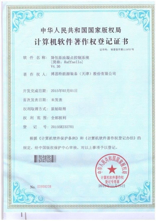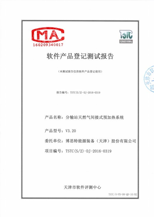 2016年3月24日顺利通过天津市软件评测中心测试,并拿到测试证明文件,标志着公司嵌入式软件集成的研发成功。该两款软件已应用于公司的原油降凝剂橇装加注系统和天然气电加热器的控制系统,有效提高了操作的自动化水平以及控制的安全可靠性,极大提高了产品的市场竞争力。